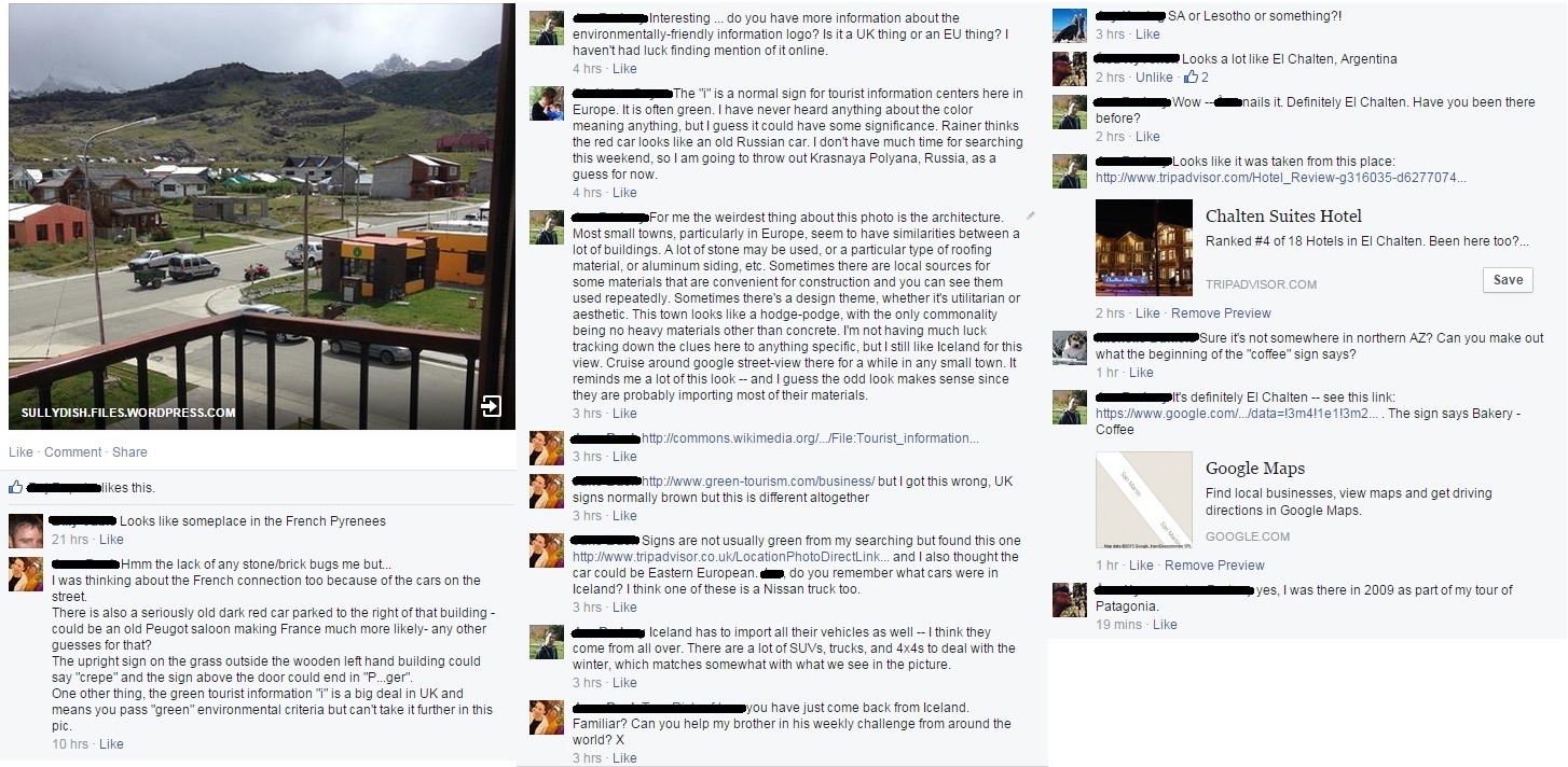 First, I ruled out countries that drive on the left side, so it couldn’t be New Zealand or South Africa. Next, I ruled out real northern mountains (Canada, Alaska, Norway), because of the lack of evergreen trees, and the lack of snow. Right now, it’s winter here in the Northern Hemisphere. A place at this altitude would be covered in snow and ice. So I figured it was South America. My first hunch was Chile. So I started looking at Chilean license plates, but they didn’t look right. The license plate in the picture looks like it has a black spot in the middle. I googled photos of traffic in Argentina. Cars in the distance, ones whose plates are too far to read, appear to have a black spot in the middle (because the plates are black with white letters, and there’s a large black space between the letters on the left, and the numbers on the right). So I googled Patagonian mountain town images. One of the first towns I found was El Chaltén. Everything looked right: the snowcapped mountain, the greenery, the architecture. I confirmed it when I kept seeing photos of the building with the huge red roof (in the top right corner of the VFYW photo).