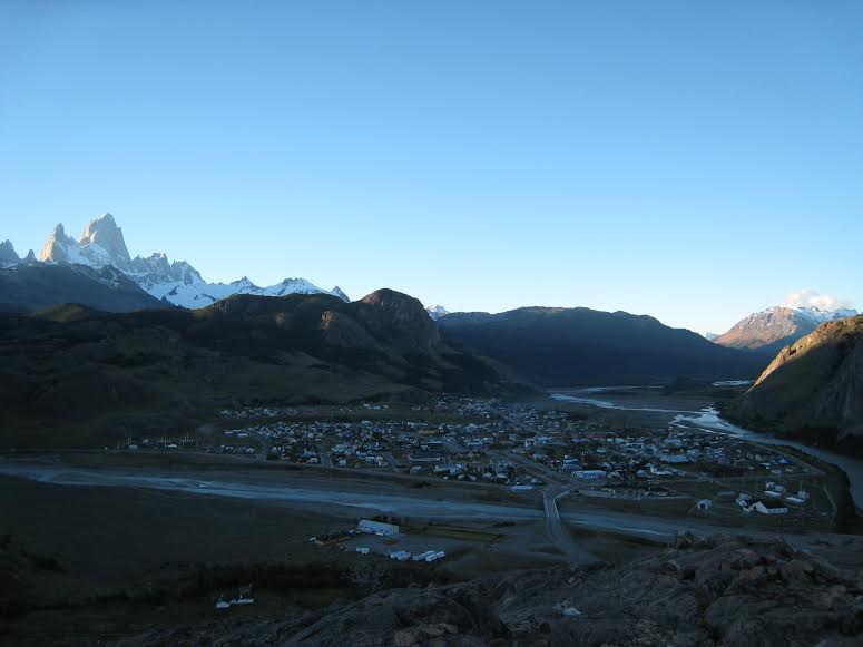 My stepson and I visited Patagonia over the New Year to do some backpacking and hiking. Our first stop was in El Chalten, Argentina, where we spent one night in town before backpacking up to the South Patagonia Icefield for four days, to climb a peak called Gorra Blanca (incredible experience, for those considering a trip). El Chalten only came into existence in 1985, solely because Argentina wanted to keep an eye on the disputed border with Chile that lies just to the west. It is now a tourist town catering to the many trekkers and climbers making the pilgrimage to the Fitz Roy massif. We were staying at the relatively new (less than a year old) Chalten Suites Hotel. Our view was spectacular except for the clouds on the first day, without which this view would have been easily identifiable. When we returned from our icefield trip, the clouds were gone and I snapped this picture from the same window, and you can see the spectacular view of Mount Fitz Roy on the far right, and Cerro Torre on the far left: