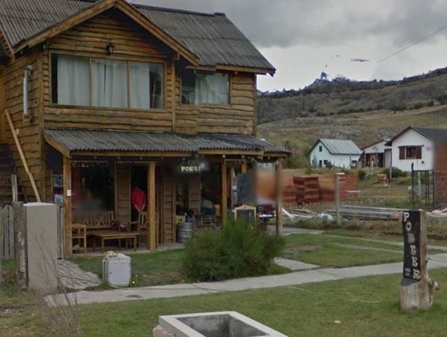 In the view, there’s a sign that sticks up over the larger yellow building that looked like it said “coffee.” So I googled “El Chaltén Coffee Shops,” and found a guy’s Twitter photo of him sitting in a hammock outside of Mathilda, a coffee shop, in El Chaltén. Mathilda is the yellow building next to the information center. You can see the information center in his photo, and I knew I was there. It was scintillating stuff. Then I used Google’s satellite map, found the roofs I was looking for – it’s not a large town – and used Street View (lucky) to put myself on that corner. I was staring at El Chaltén Suites Hotel.