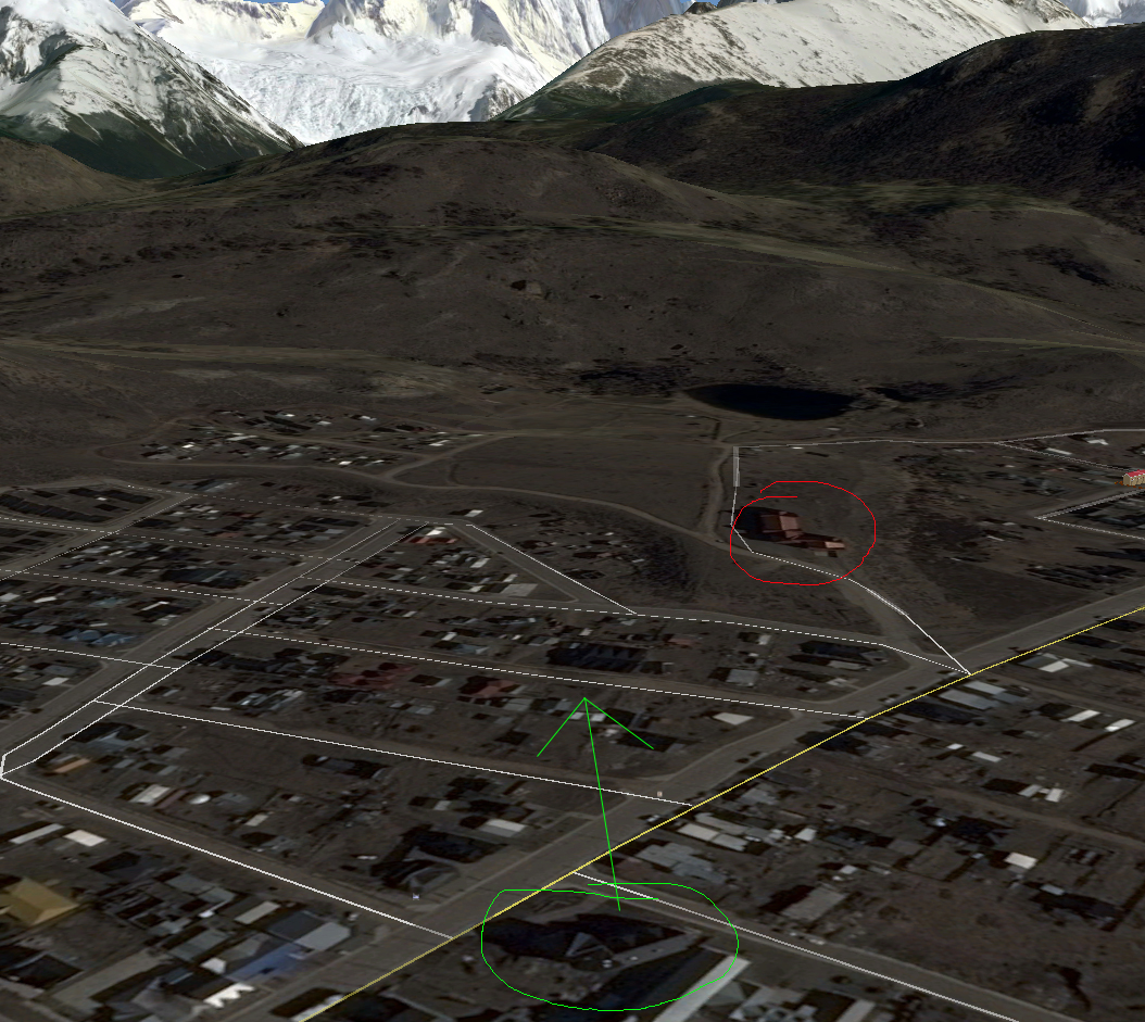 Hotel Los Cerros is circled in red and the Chalten Suites is circled in green with an arrow indicating the direction of the view: