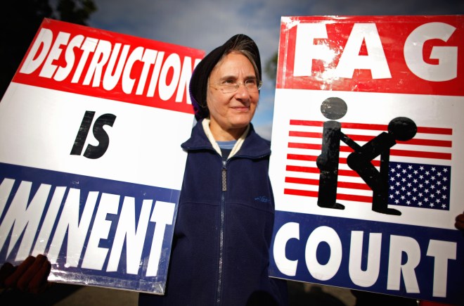 WASHINGTON – OCTOBER 06: Betty Phelps, daughter-in-law of pastor Fred Phelps and a member of the Westboro Baptist Church, demonstrates outside the Supreme Court while justices hear oral arguements in Snyder v. Phelps, which tests the limits of the First Amendment, October 6, 2010 in Washington, DC. Albert Snyder sued the Westboro Baptist Church after his son, Marine Corps Lance Cpl. Matthew Snyder, was killed in Iraq in 2006 and members of the church held signs and demonstrated outside his funeral. The church and its members preach that U.S. deaths in Afghanistan and Iraq are punishment for Americans’ immorality, including tolerance of homosexuality and abortion. (Photo by Chip Somodevilla/Getty Images)