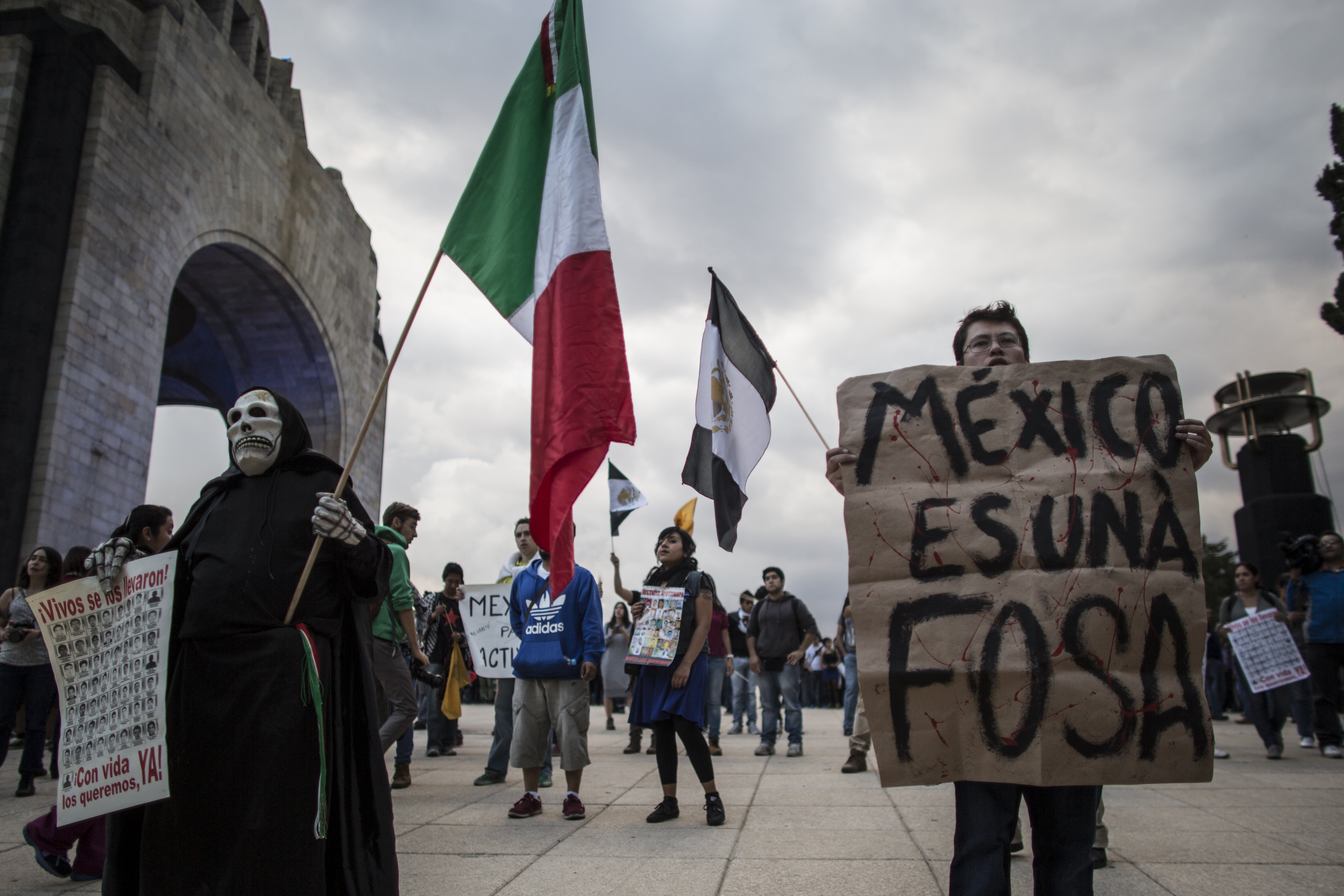 (In Mexico City, Mexico on November 16, 2014 a protester holds a sign reading “Mexico is a grave” during a demonstration against Mexico’s government. By Miguel Tovar/LatinContent/Getty Images)