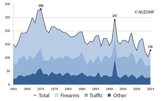 On Tuesday, the National Law Enforcement Officers Memorial Fund, a pro-police nonprofit, released its preliminary 2014 report on officer deaths, which listed the total number of fatalities at 126. Most striking was the number of firearms-related deaths in 2014 (50), which was a 56 percent jump from 2013 (32). The second-leading cause of death for police were traffic-related fatalities (49), an increase from last year (44), when it was the year’s leading cause, according to the group’s data. NBC added that, despite the increase, 2014’s total of 126 is well below the average of 151 for the past decade.