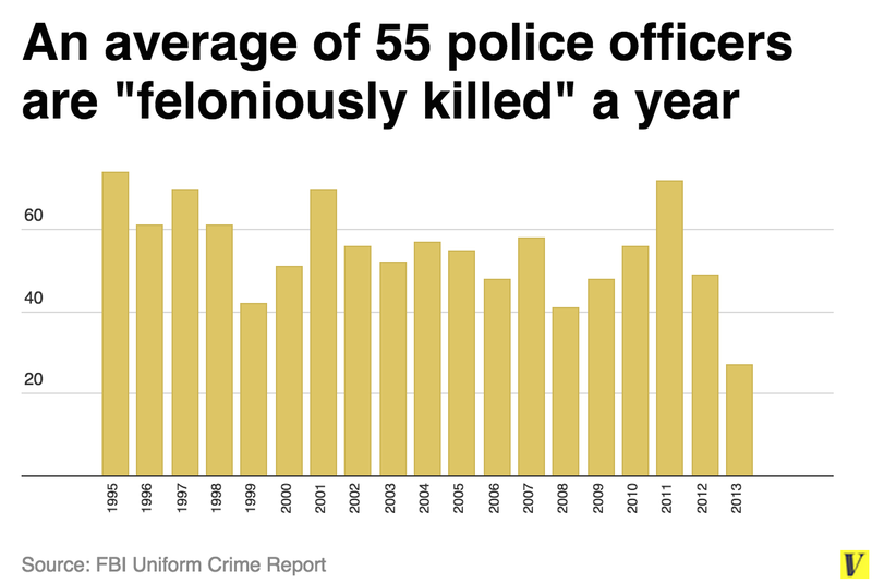 Even counting accidental deaths, the FBI’s numbers are lower than the Memorial Fund’s: the FBI reported that 78 officers were feloniously or accidentally killed in the line of duty in 2013, for example, while the Memorial Fund says that 102 were. Two factors that could help explain the disparity: the FBI doesn’t collect data from every law enforcement agency in the country (its 2013 report covered 78.2 percent of America); and the Memorial Fund counts deaths from “job-related illnesses” as officer fatalities.