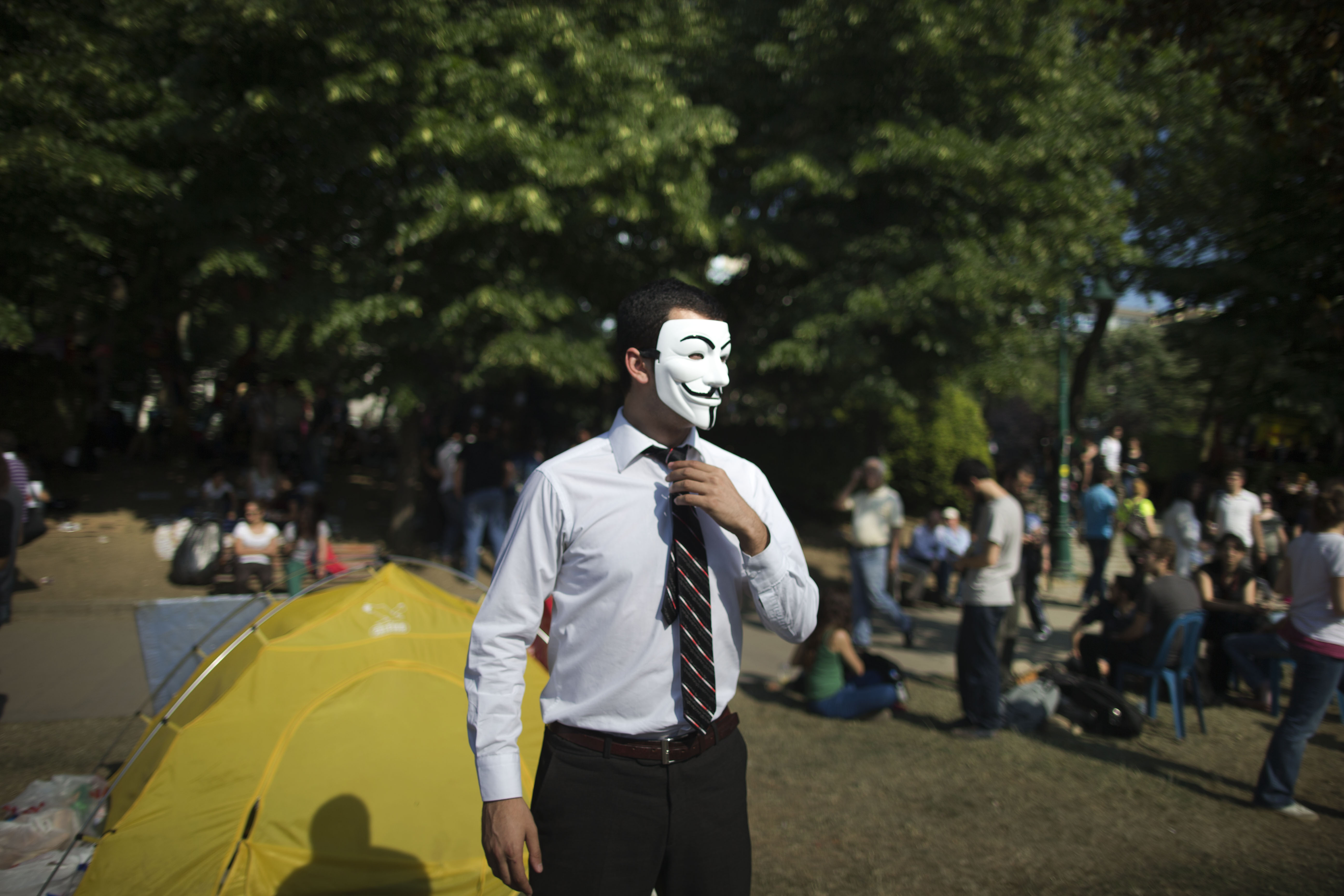 (Photo: A protestor wearing a gas mask walks in front of a burning car on Taksim square on June 11, 2013. Turkish police fired massive volleys of tear gas and jets of water to disperse thousands of anti-government demonstrators in Istanbul’s Taksim Square on June 11, after earlier apparently retreating. The gas sent the crowd scrambling, raising tensions on a 12th day of violence after Prime Minister Recep Tayyip Erdogan warned he had ‘no more tolerance’ for the mass demonstrations. By Bulent Kilic/AFP/Getty Images)