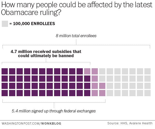 The federal appeals court in the District of Columbia ruled 2-1 this morning that the Affordable Care Act doesn’t authorize the federal government to provide subsidies to low- and middle-income Americans to buy insurance in the 36 states where the federal government set up exchanges to sell health-care coverage. Just two hours later, a three-judge panel of the Fourth Circuit Court of Appeals in a similar case unanimously found just the opposite — that the IRS correctly interpreted the text of the ACA when it issued a rule allowing all public exchanges, regardless of who set them up, to provide insurance subsides.