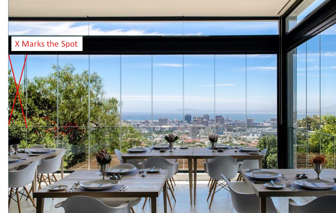 The window is the large glass wall of the MannaBay’s dining room facing north. There are many wonderful pictures of the room and the window online, including this one. The angle and stone wall along the left edge of the contest photo means the photographer was standing above the table against the left (western) wall of the room: