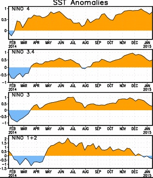 You can see that the Niño 3.4 region was warm … nearly El Niño criteria for much of the first half of the year, and near or above the criteria over the last several months. But not quite breaking it. Further west, in the Niño 4 region, it was quite a bit warmer. So yes, technically not an El Nino year, but almost.