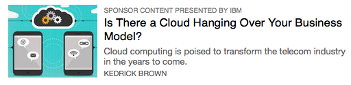 On the same page, we have two other ads by IBM, an infographic by IBM, two more stories written by IBM, three links to IBM pages, and one IBM video. It’s made legit by a tiny box up top, which you have to roll over to find out that:
