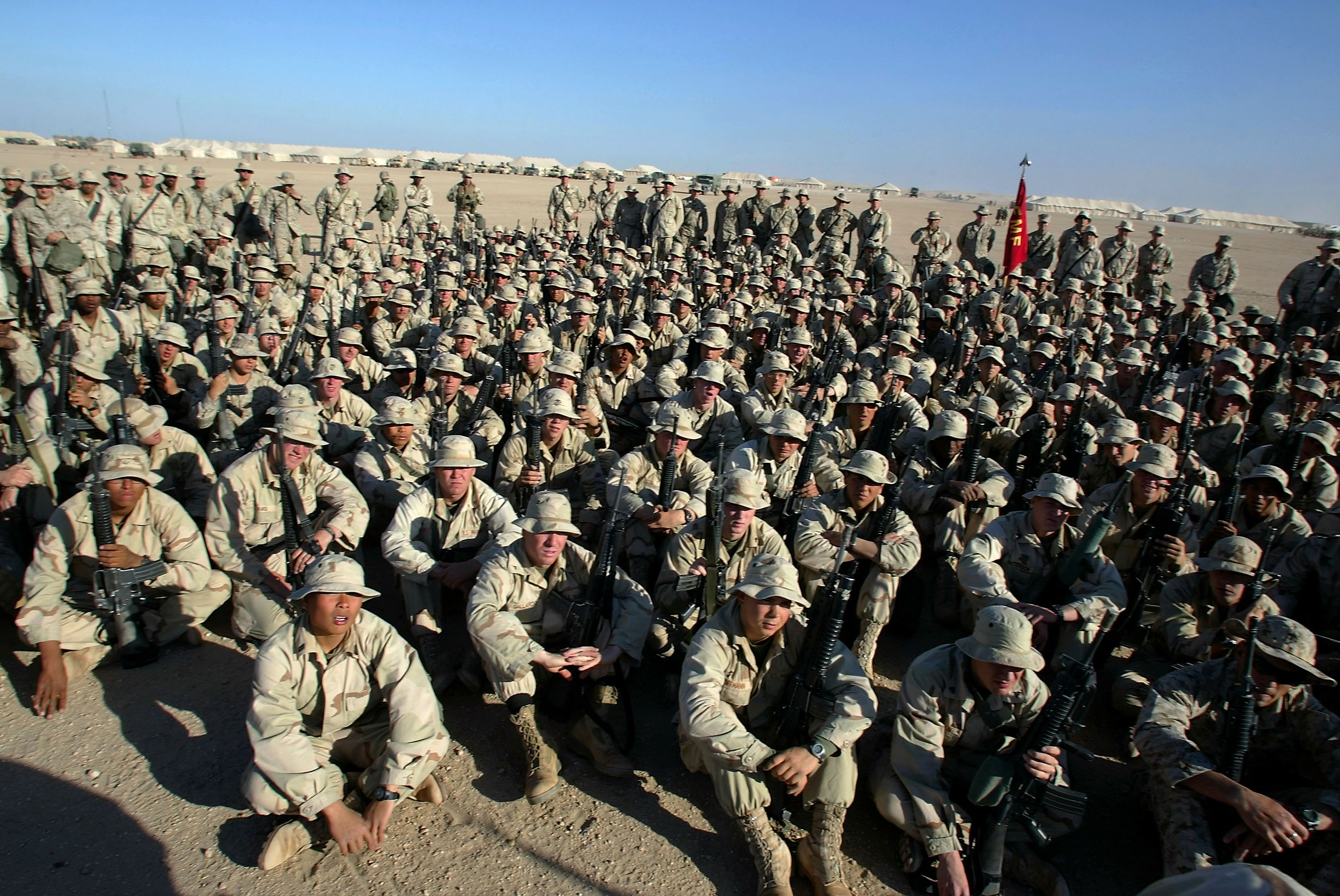 (Photo: U.S. Marines from the 1st Marine Division, 3rd Battlion, 7th Regiment listen at a pep talk at Life Support Area 7 March 8, 2003 in northern Kuwait, 20 miles south of the Iraqi border. By Robert Nickelsberg/Getty Images.)