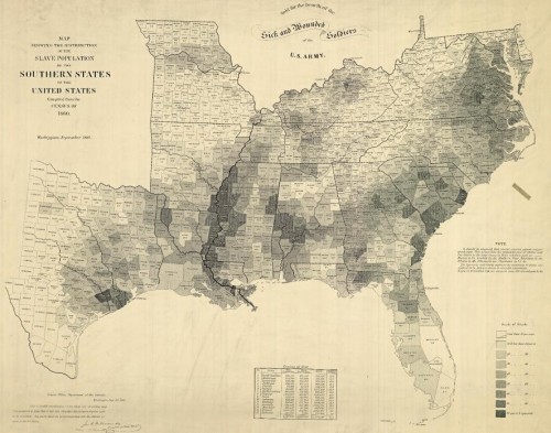 Also, low mobility is not just in “the South”, or even “the deep South”, but in the specific parts that have a high percentage of African-American population: the Mississippi Delta, the black belt of Alabama (so-called originally because of its soil, but it also applies demographically). Compare the South in the mobility map to this map of county-by-county presidential election results from 2008, which in the South reflects where African-American voters are concentrated. (Or, for that matter, this map [seen right] of the last slave census, in 1860.)