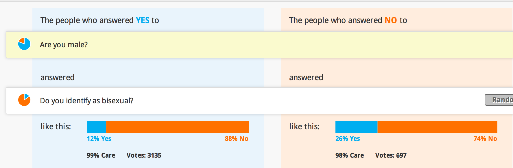 The above screenshot from our unscientific poll shows that 12 percent of male respondents identify as bisexual while 26 percent of female respondents are bi. Of all the straight-identified respondents, 21 percent say they have had a pleasurable sexual experience with someone of the same gender. And 26 percent of respondents do not believe that bisexuality is a sexual identity of its own. Read all of the results here. Below are more stories and observations from bisexual men who bristled at the previous readers who doubted their existence: