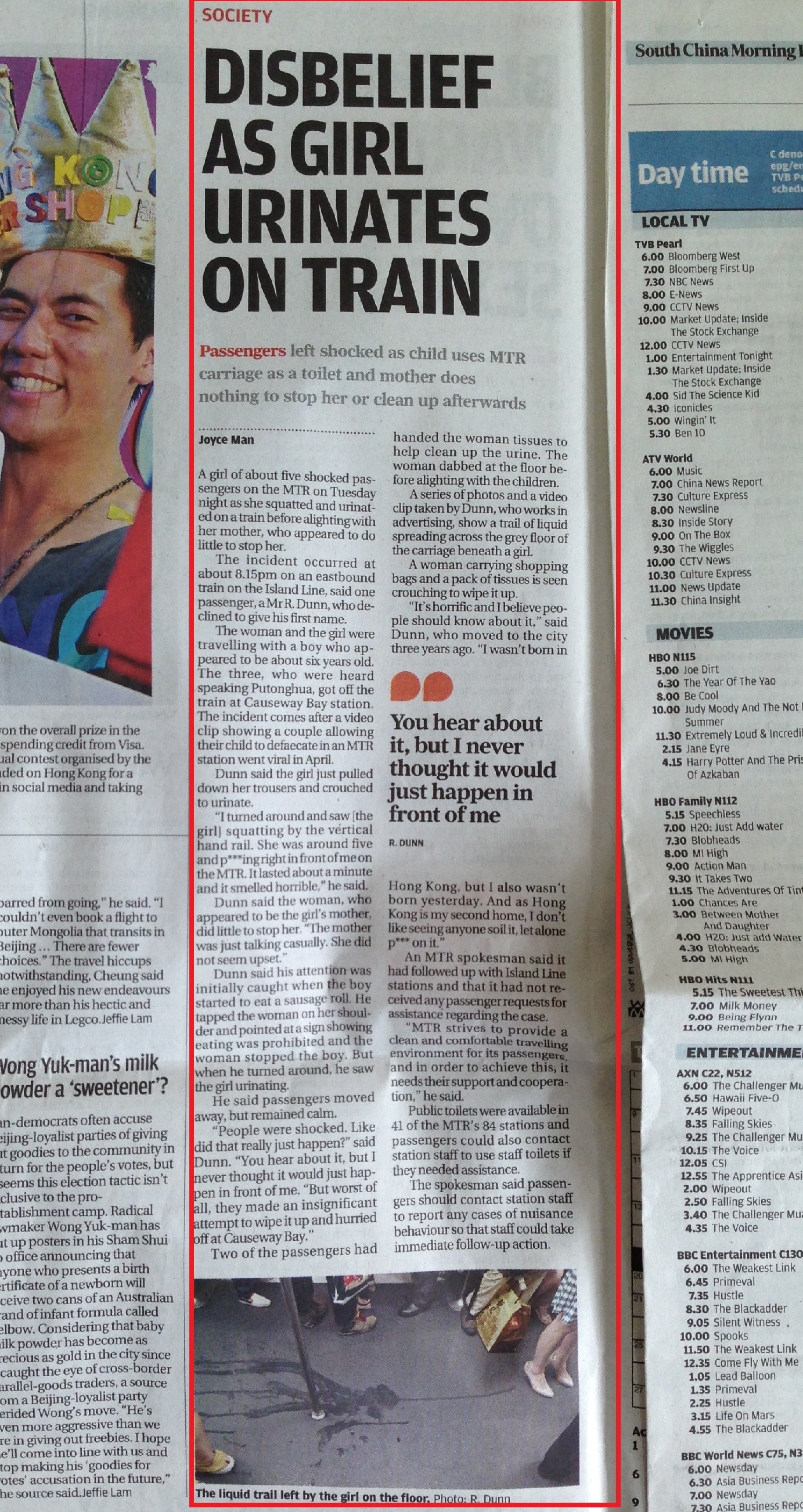 especially infuriating because there is always a sizable line for anything you want to do in Hong Kong, whether it’s for McDonald’s or tickets to see the Big Buddha or adding more money to our Octopus cards). Where things should be orderly, people without 公德心 bring chaos. Just a couple of weeks, ago, the South China Morning Post published an article entitled “Disbelief as Girl Urinates on Train” – along with a reader-submitted picture, no less! – about an unidentified mainland child who with the permission of her mother pulled down her pants and peed in a MTR (subway) carriage. Funnily enough, the collective disdain for the ill-mannered mainland Chinese rube has fostered not only a sense of anti-mainland prejudice but a sort of Hong Kong “pride” (Irony #2): many think (whether rightly or wrongly) of Hong Kongers as being more polite, cultured, classy–a better strain of Chinese people overall. We cluck our tongues when even North Korea shakes its head at Chinese tourists; we feel validated whenever some other country’s citizens point out how rude they can be.